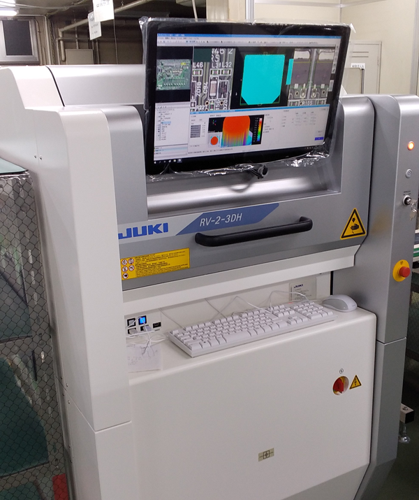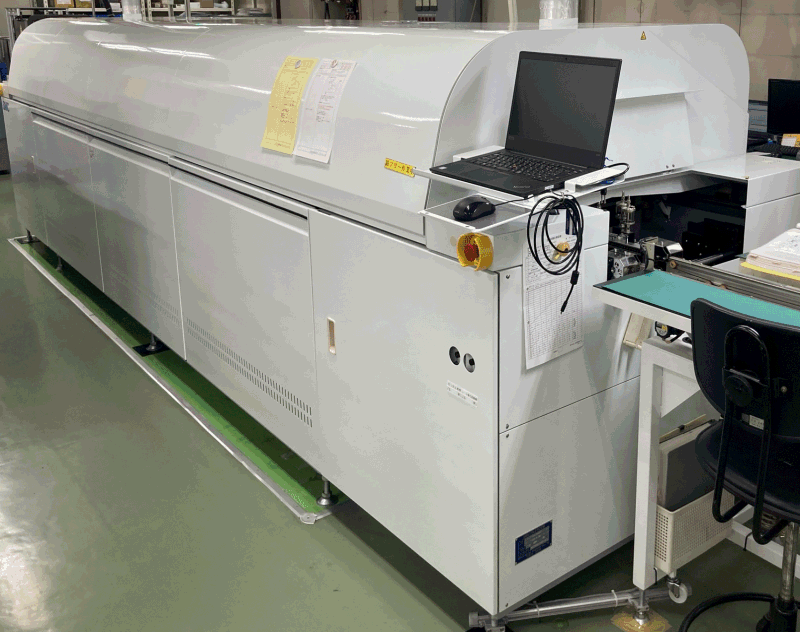 半田付け装置として、ポイント噴流半田装置を使用しています。タクトタイム は、自動噴流型リフロー槽より遅くなりますが異なる熱容量の部品が実装されていても部品ごとに条件が設定できます。