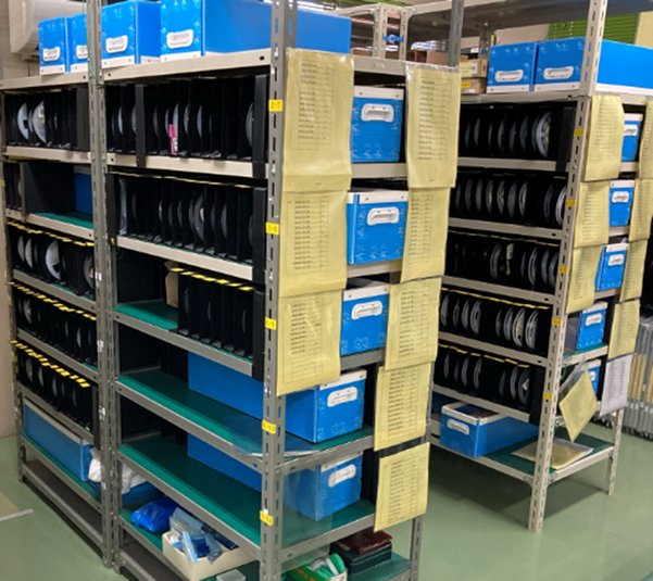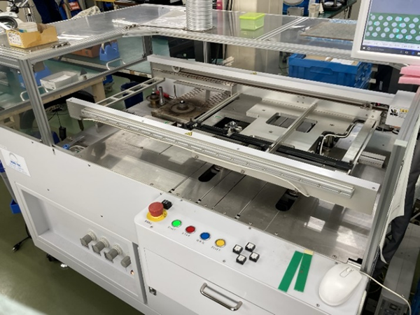 部品実装は、実装支援装置を使用しています。この装置は部品実装時に『部品供給』『部品実装箇所指示』『実装時注意事項伝達』を行います。