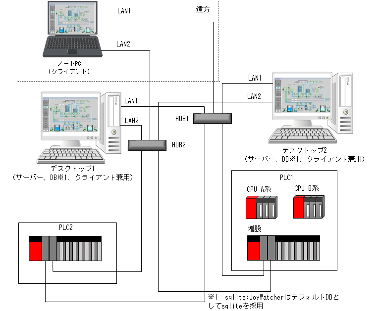 ノートPCは監視用でデスクトップ1(LAN1専用)またはデスクトップ2(LAN2専用)を通して監視する仕様となっています。