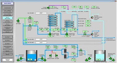 様々な機器の状態やプロセス値をSCADAに取り込めば図2のように画面が表示できるため「運転」、「停止」、「故障」等の設備状況をリアルタイムで監視が可能となります。また、画面のボタンより機器の操作を行うことが出来ます。