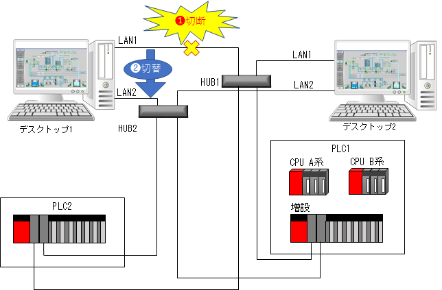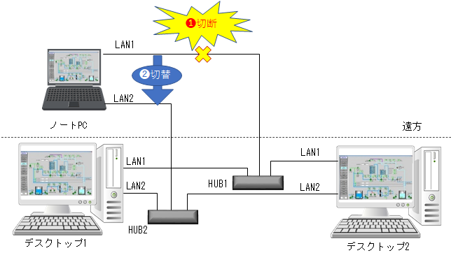 図5のようにデスクトップ1のLAN1の接続が切れてしまった場合には自動的にLAN2に切り替えて監視・制御を引き続き行えるようになっています。