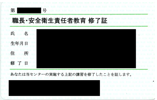 以上は労働安全衛生法第60条で定められている職長・安全衛生責任者の講習を受けなければ、資格を得られません。 講習を終えると図1に示すような修了証がもらえます。現場によっては修了証の写しの提出や原本の提示を求められることがあります。