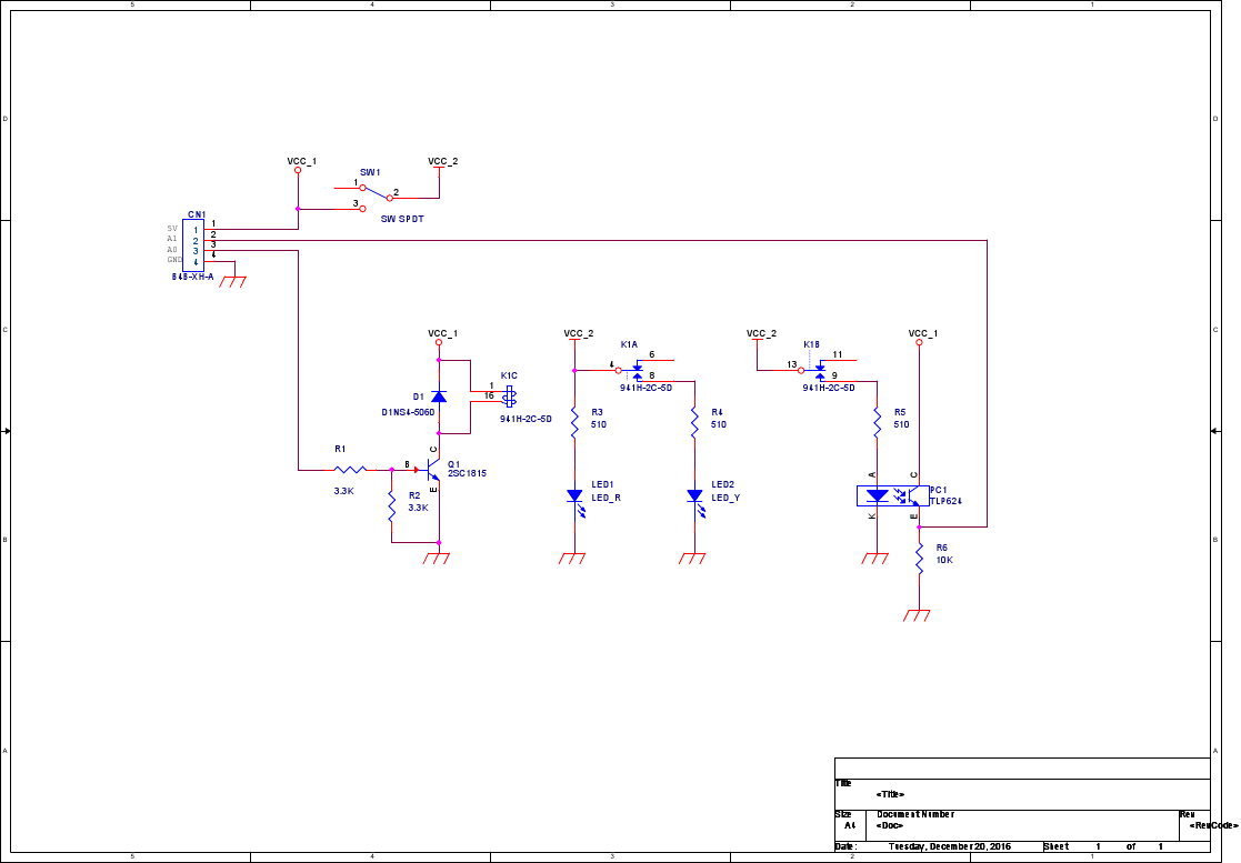 回路図にはリレーとトランジスタ、ダイオード、LED、フォトカプラ、抵抗、トグルスイッチがあります。トランジスタはGenuino101からの信号を受けてリレーのコイルを励磁するために使用しています。ダイオードはリレーのコイルに発生する逆起電力からトランジスタを保護するために、使用しています。LED1はリレーの接点側の回路の電源ランプです。LED2はリレーの接点が閉じたときに点灯します。